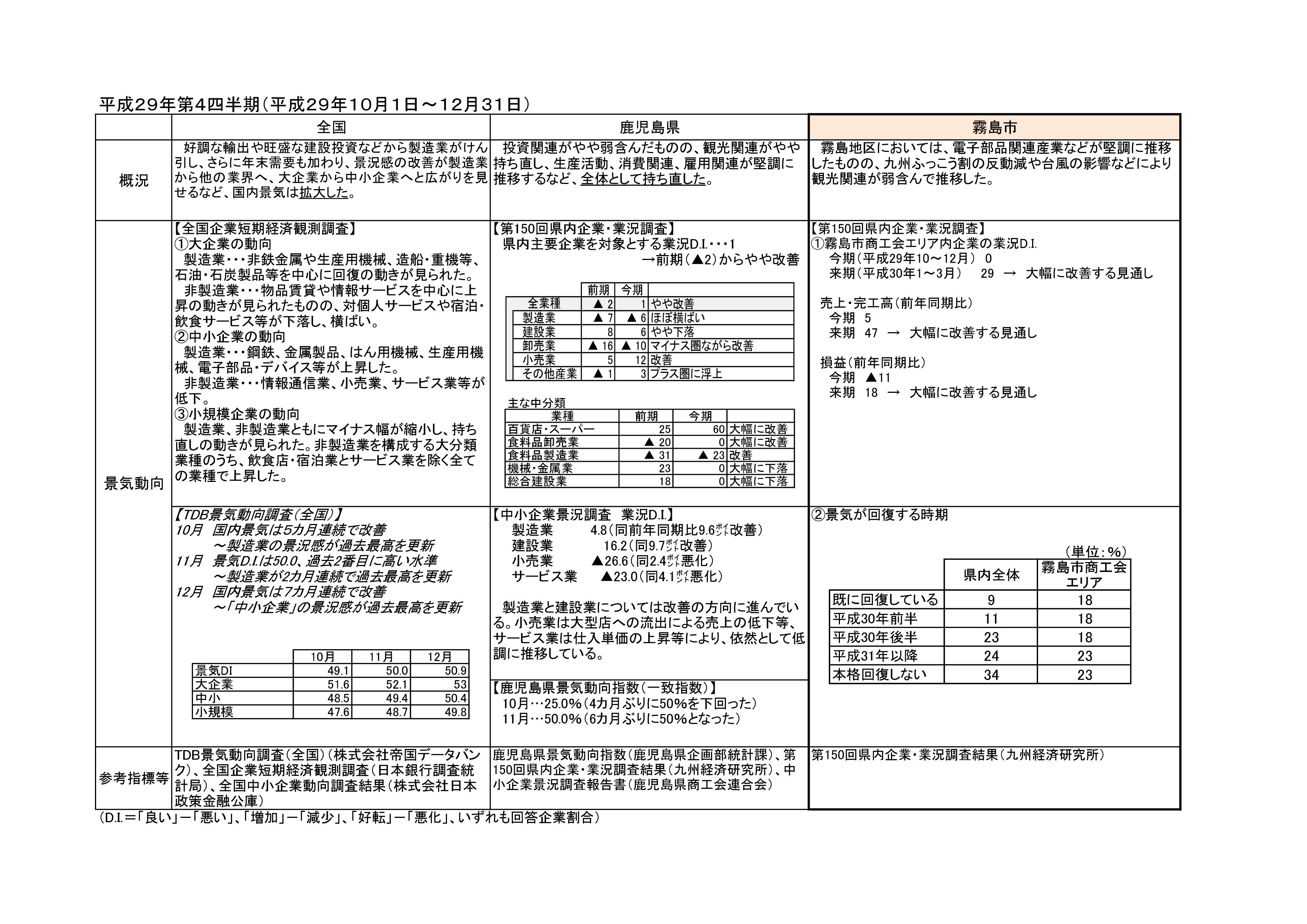 伴走型小規模事業者支援推進事業に基づく霧島市の平成29年10月~12月期の景気・経済動向調査の結果を公表します