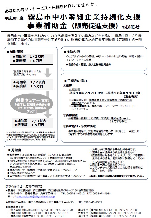 下記の通り霧島市の販売促進支援の補助金募集が開始されます。