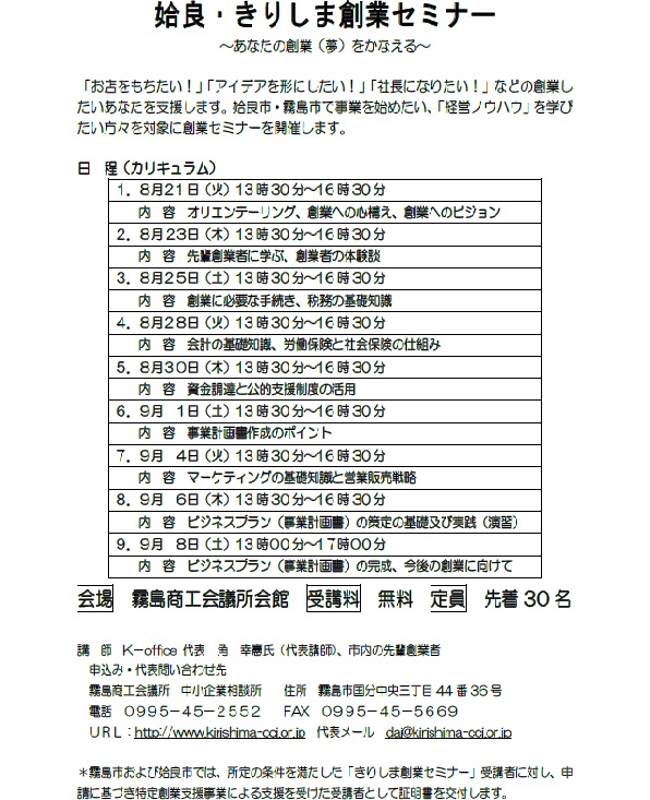 姶良市・霧島市で事業を始めたい方、経営ノウハウを学びたい方々を対象にした創業セミナーです。