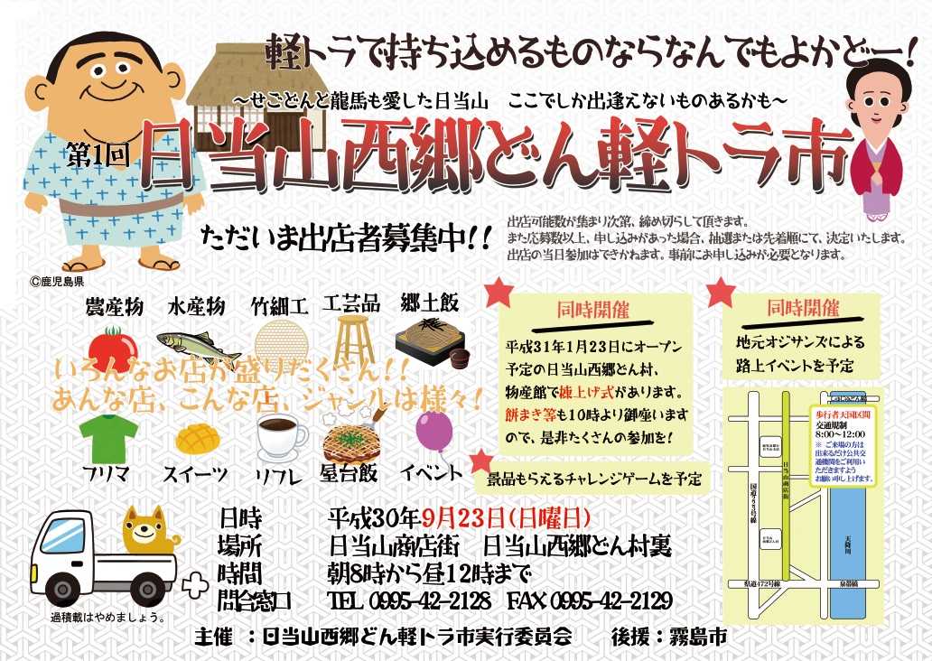 9月23日午前8時から12時まで日当山西郷どん村裏 日当山商店街で軽トラ市が開催されます。