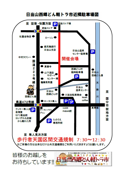 9月23日日曜日開催の日当山西郷どん軽トラ市一般駐車場は下記のとおりです。