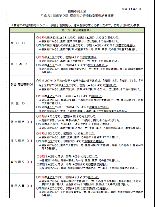 平成30年4月~平成31年9月期について、特産品製造業及び観光関連産業に関する経済動向アンケートがまとまりました。