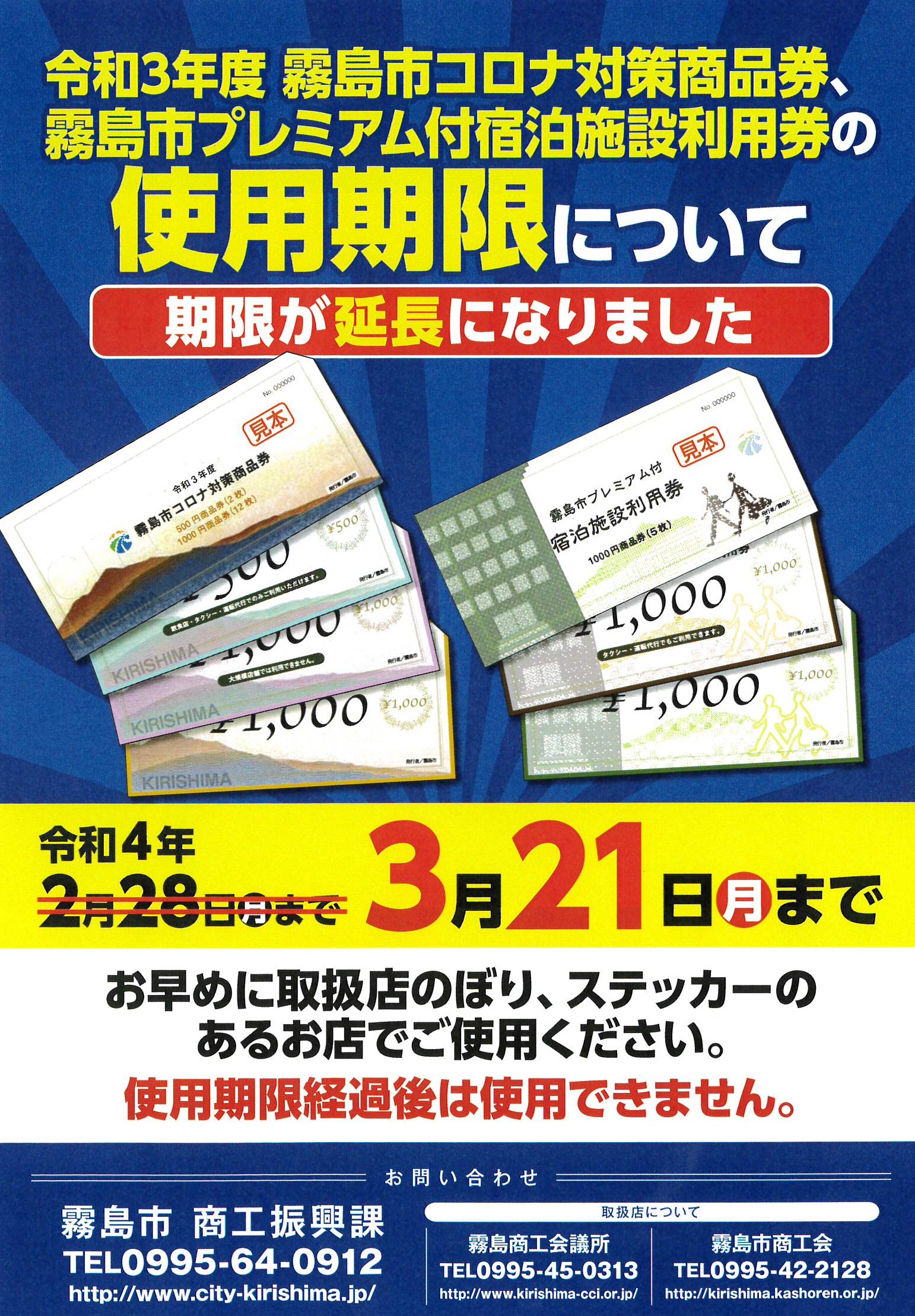 なお、先日お知らせいたしました通り、霧島市発行の令和3年度「コロナ対策商品券」と「宿泊施設利用券」の使用期限が下記の通り延長となりましたので、お忘れなくご使用ください。