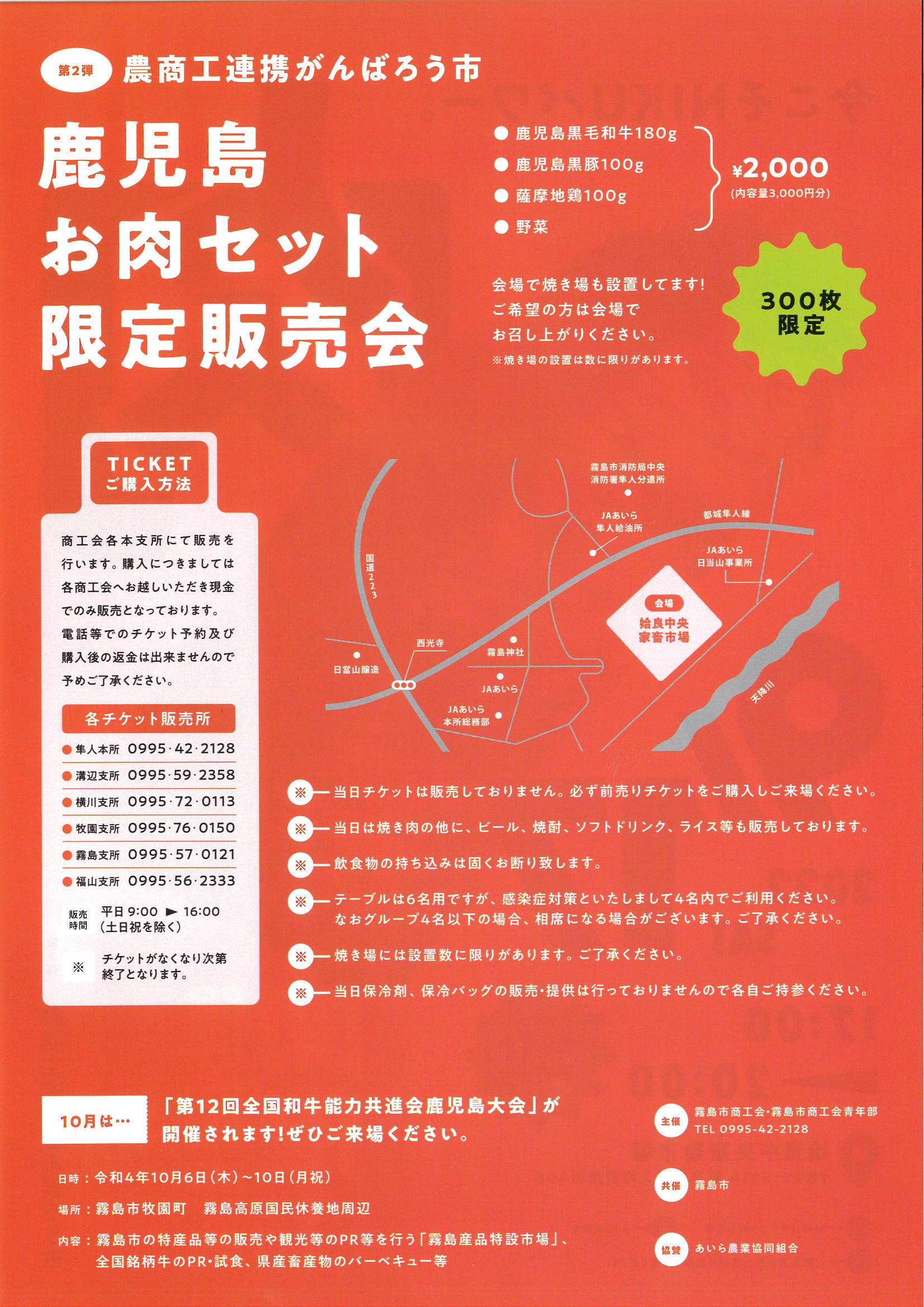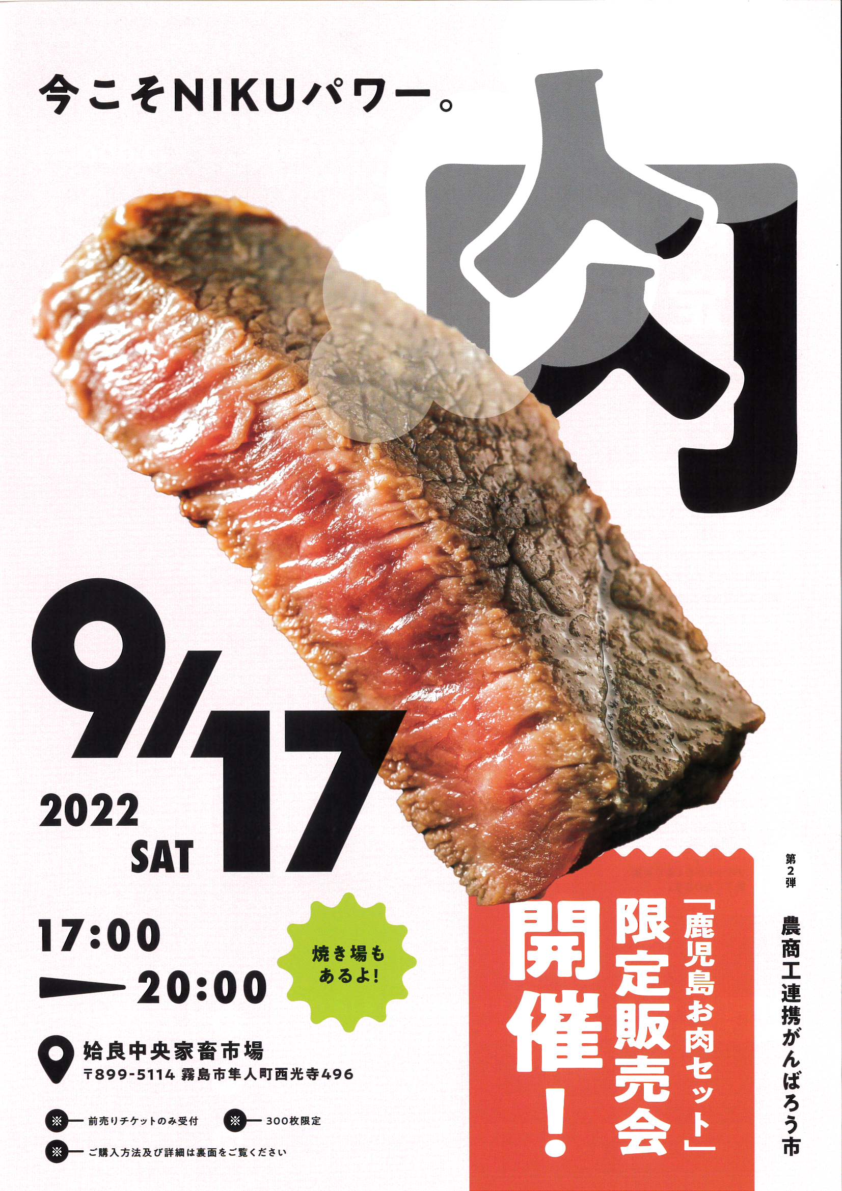 前売りチケットをご購入の方に、「お肉セット」を9/17(土)当日会場でお渡し致します。また、確実なお渡しの為にチケットご購入の際にご連絡先等の確認をさせて頂きます(例:台風接近などの場合ご連絡)。また、チケットは商工会各本支所で販売しています。枚数に限りがあり、チケットがなくなり次第終了となります。ご了承くださいませ。