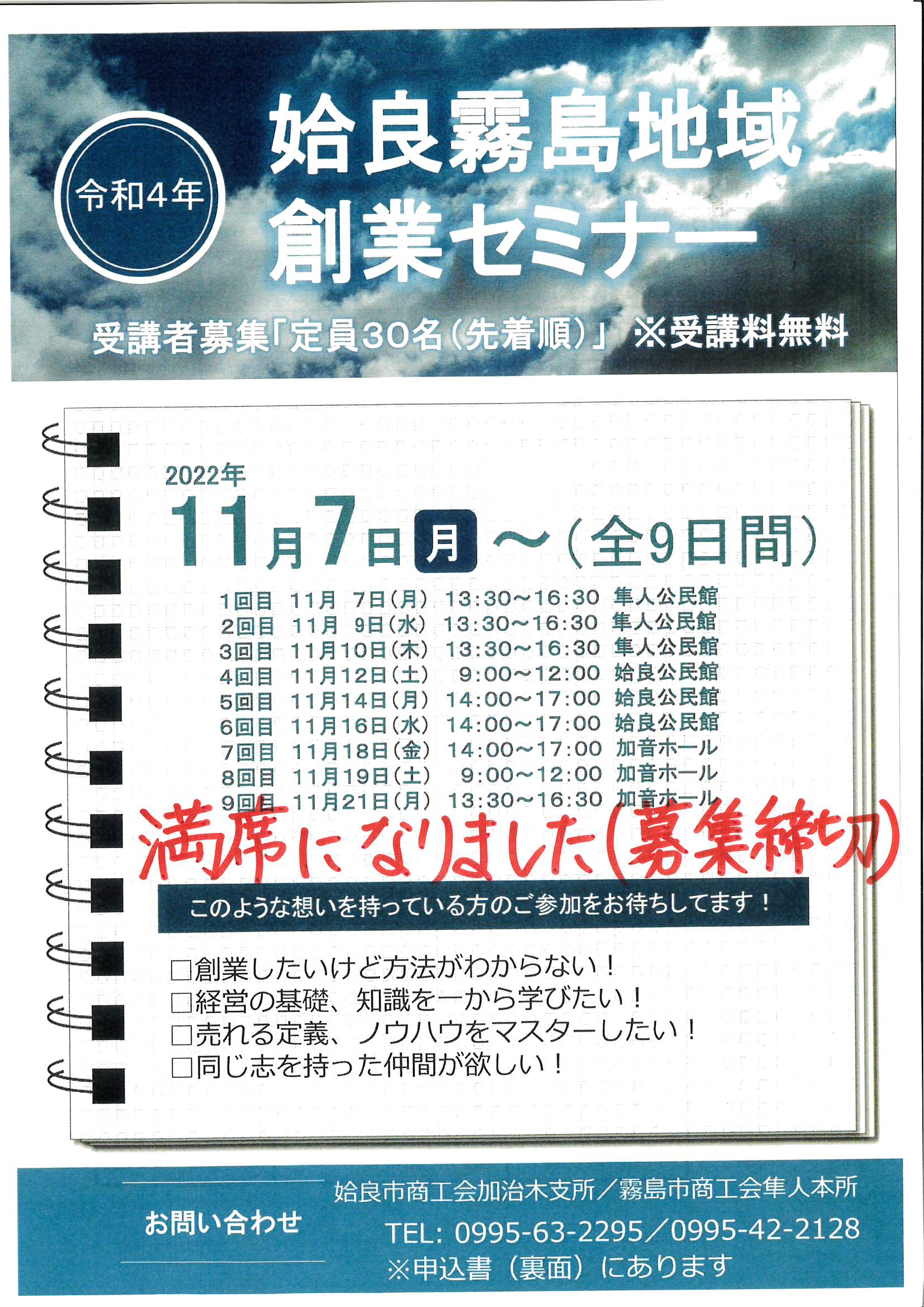 【令和4年姶良霧島地域創業セミナー】は定員いっぱいのお申し込みがありましたので募集を締め切りました。創業等のご相談はお近くの商工会・商工会議所の窓口などをご利用ください。