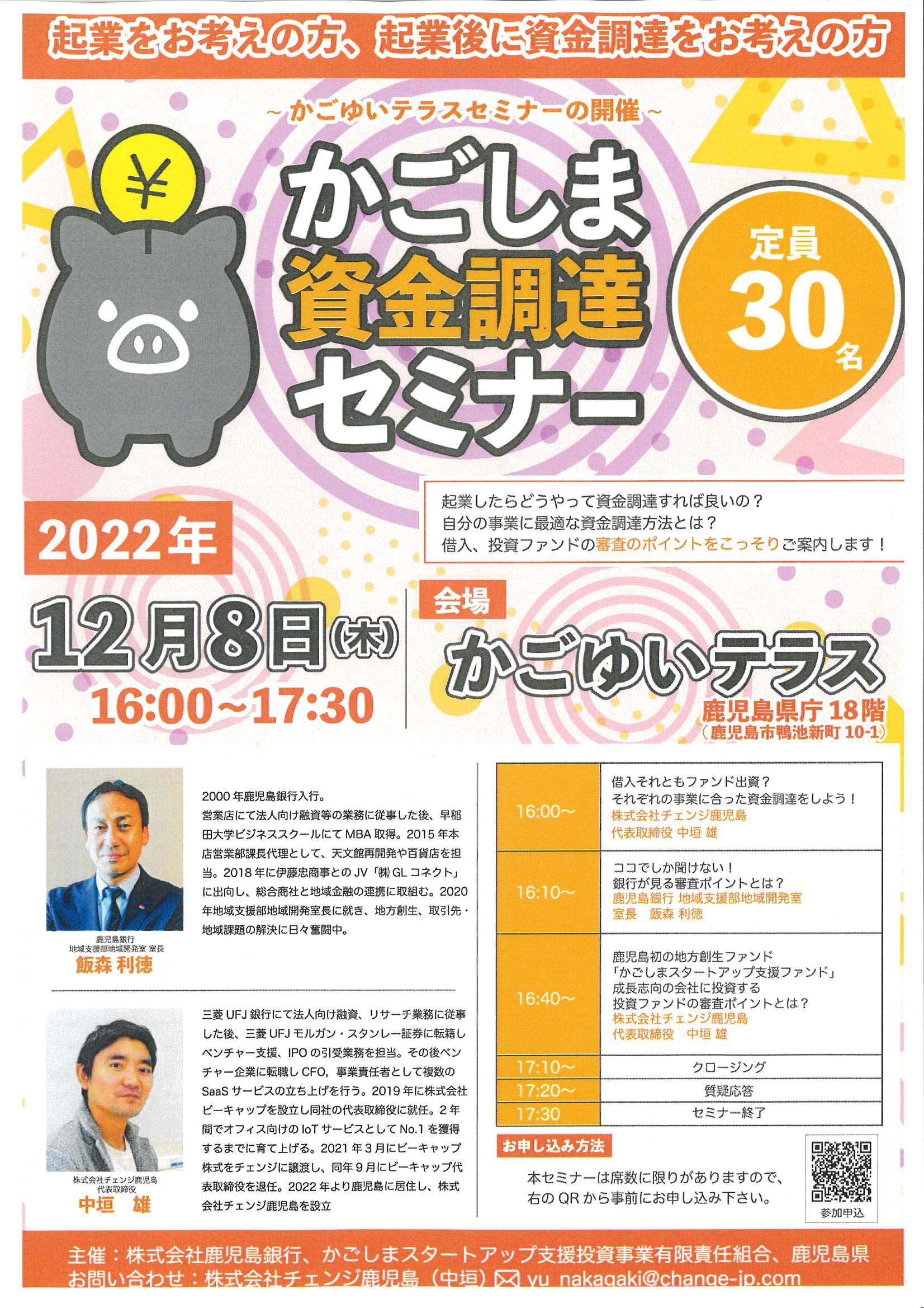 鹿児島県では,株式会社鹿児島銀行,かごしまスタートアップ支援投資事業有限責任組合と共同で12月8日(木)に県庁18階かごゆいテラスで『かごしま資金調達セミナー』を開催することとしました。