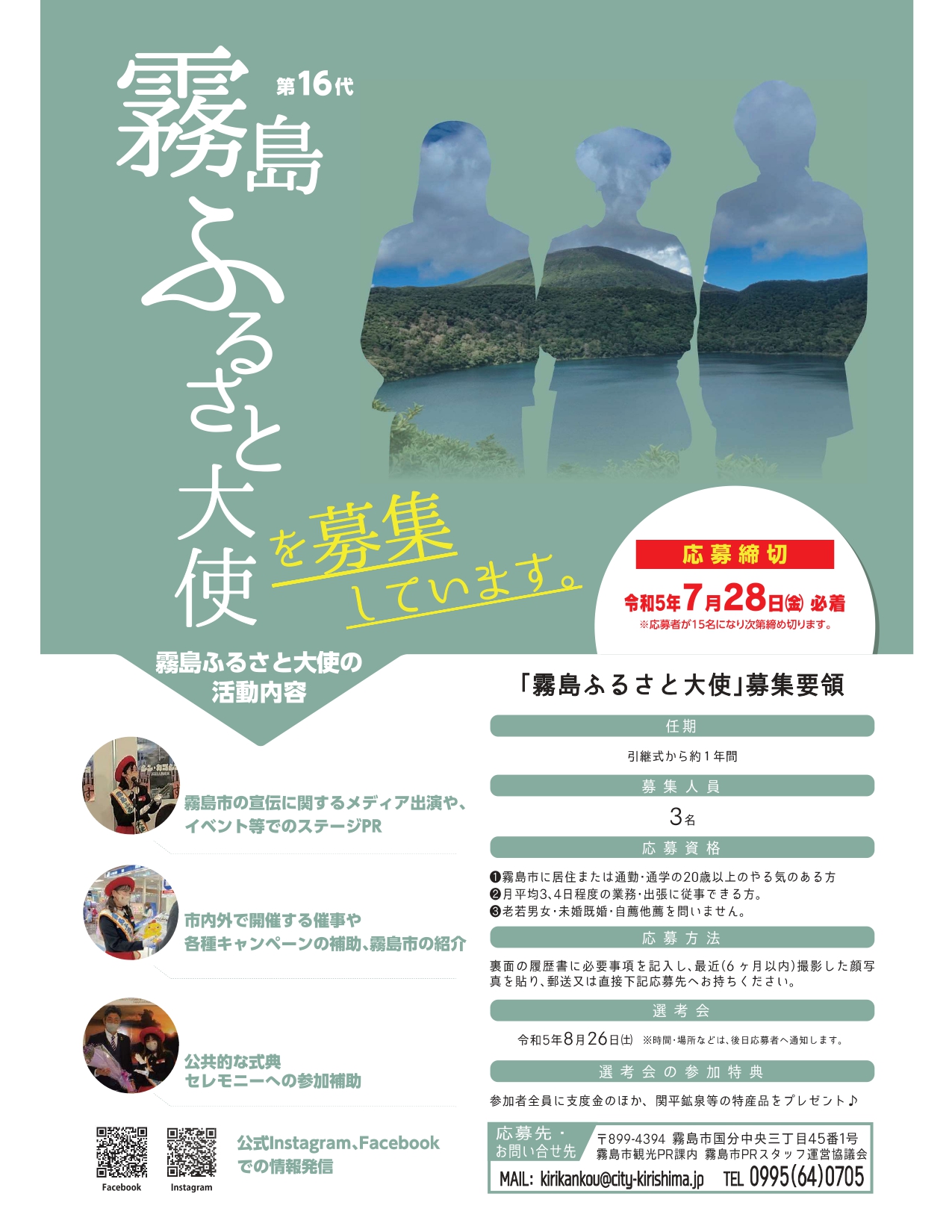 霧島市PRスタッフ運営協議会では、霧島市の魅力を国内外にPRするため、市内外で開催される観光宣伝や物産展など各種イベントに参加していただく、第16代霧島ふるさと大使を募集しています。多くの出会いがあり、貴重な経験を積むことができます。ぜひ、ご応募ください。なお、詳細については、霧島市のホームページをご覧ください。
