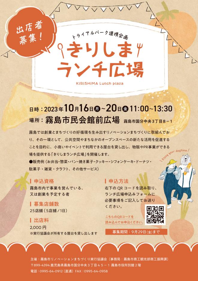 その一環として、公共空間やまちなかのオープンスペースの新たな活用を促進することを目的に、小商いやイベントで利用できる屋台を貸し出し、公共空間を活用した物販やPR事業などを行う「きりしまランチ広場」の出店者募集中です。