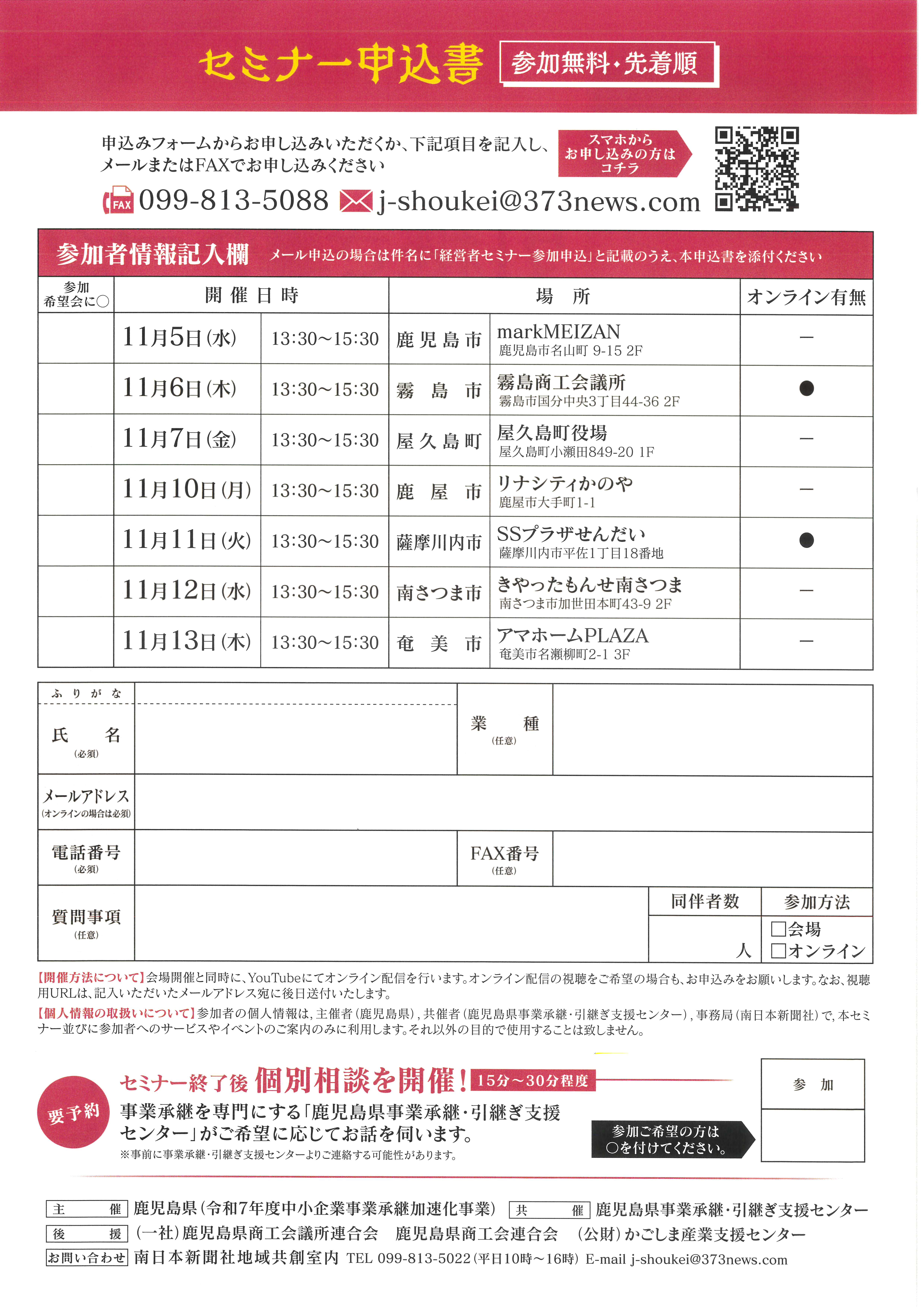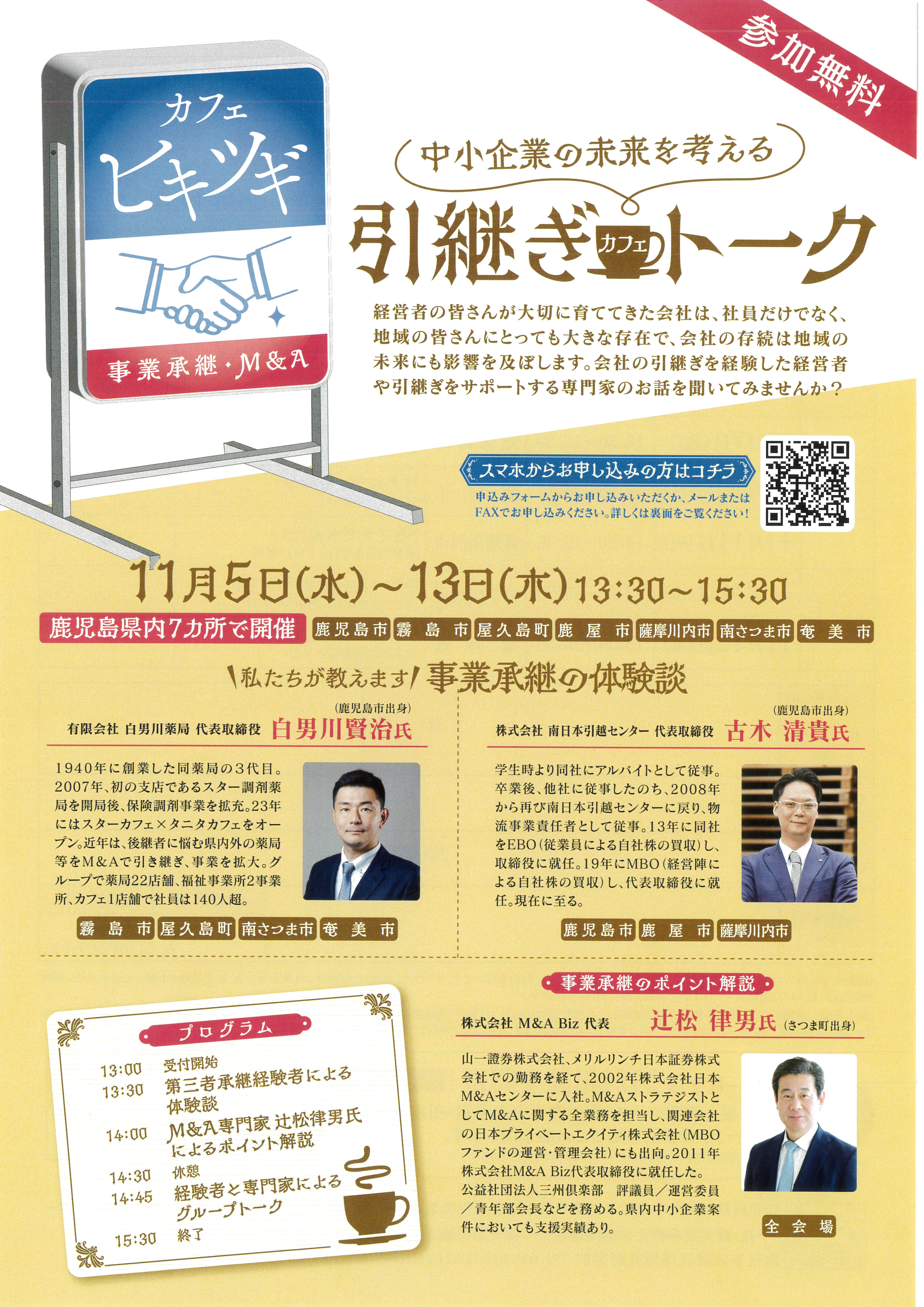 中小企業の未来を考える引継ぎカフェトークを鹿児島県内7か所で開催致します!