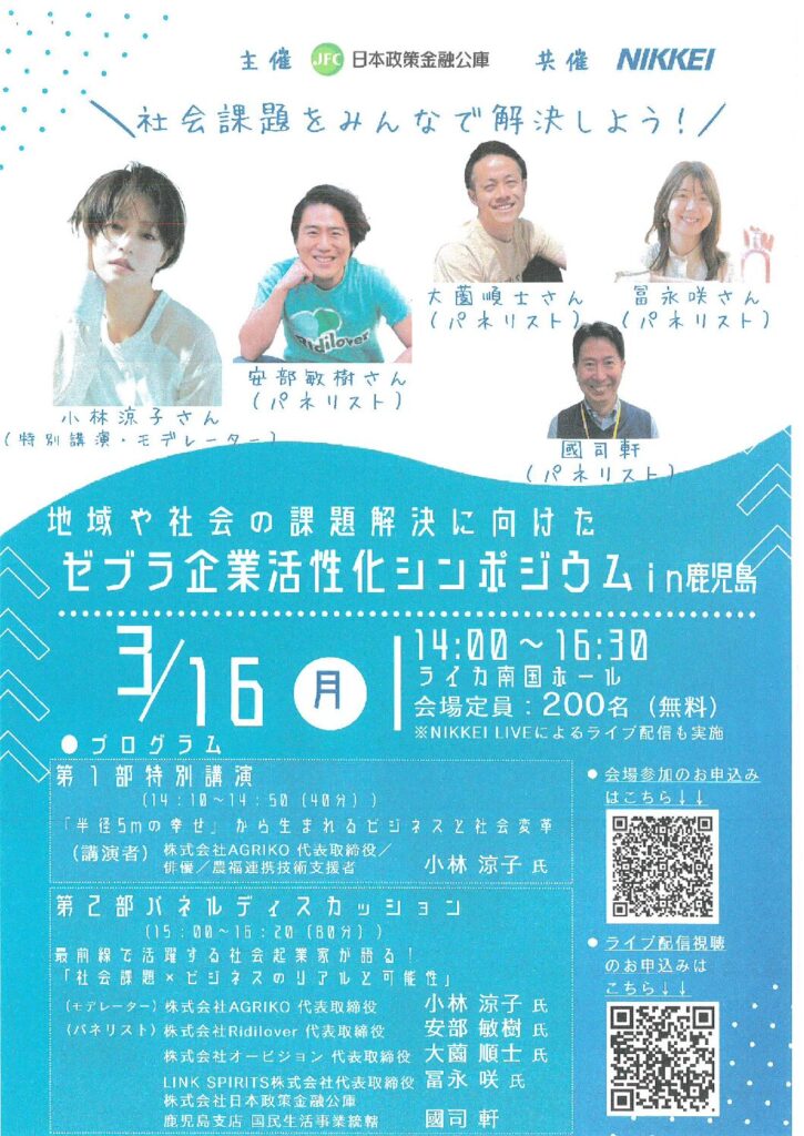 日本政策金融公庫と日本経済新聞社との共催で、地域や社会の課題解決に向けた「ゼブラ企業活性化シンポジウム in 鹿児島」を開催します。本イベントは、会場での現地参加のほか、NIKKEI LIVEによるライブ配信視聴ができるハイブリッド方式で開催いたします。