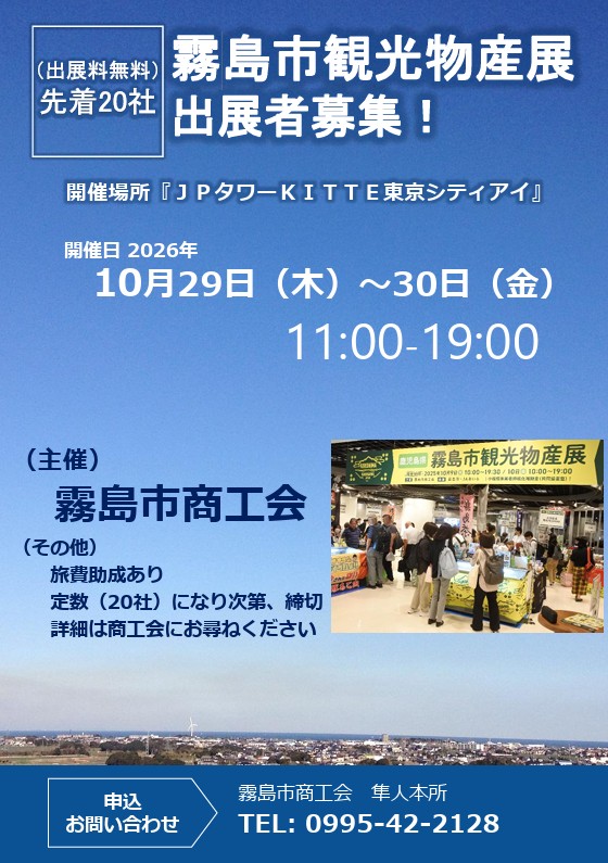 今年度の県外販路開拓支援の一環として、霧島市観光物産展を開催いたします。